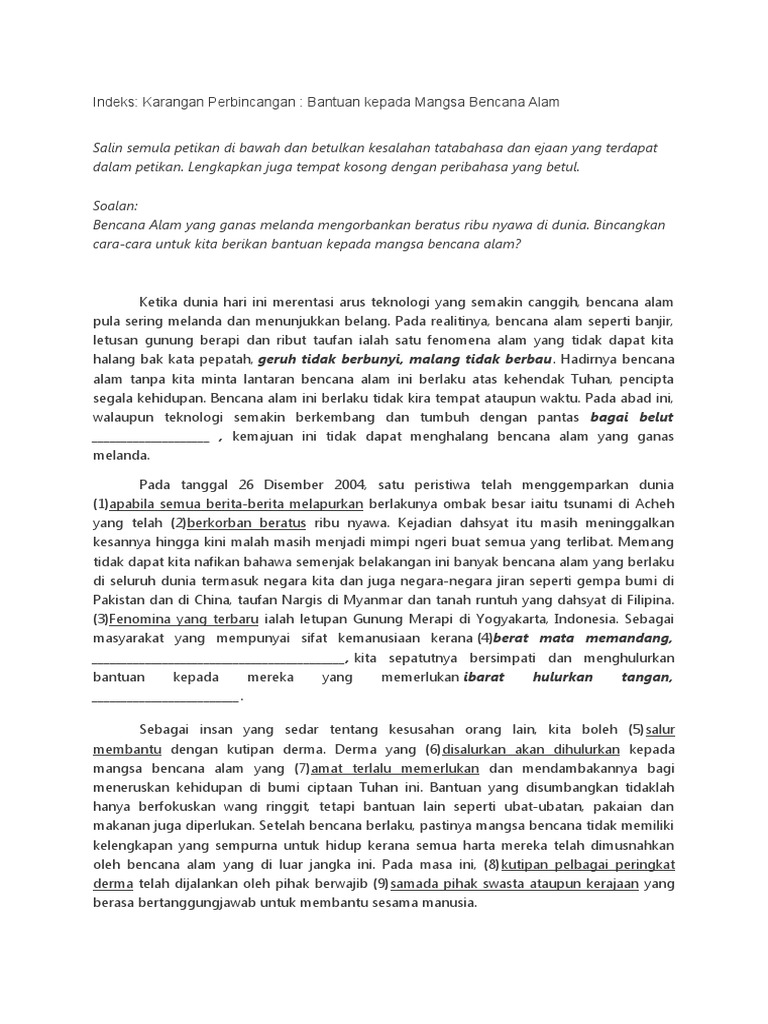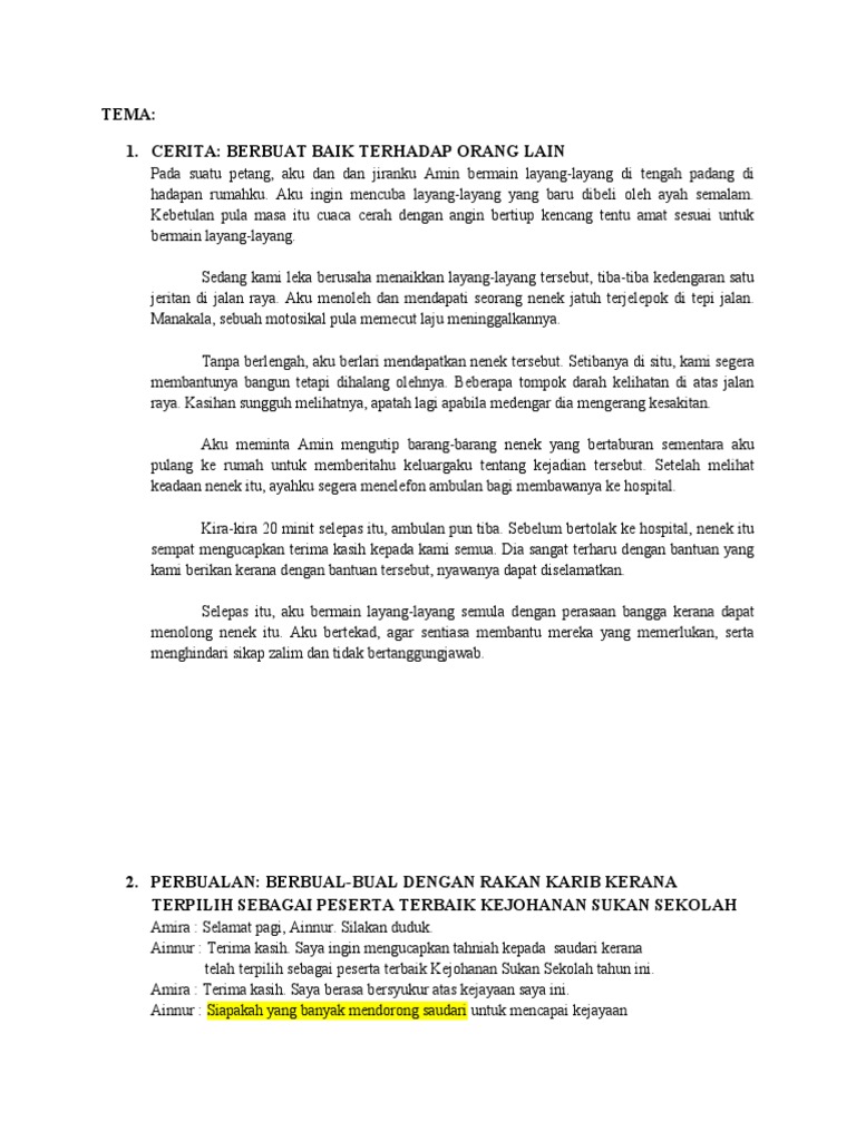 Fenomena yang terbaharu ialah letupan Gunung Merapi di Yogyakarta Indonesia. Setiap tahun ibuku pasti membeli perabot baru untuk menghiasi rumahku. Ceritakan tentang kebaikan sahabat-sahabat kamu.
